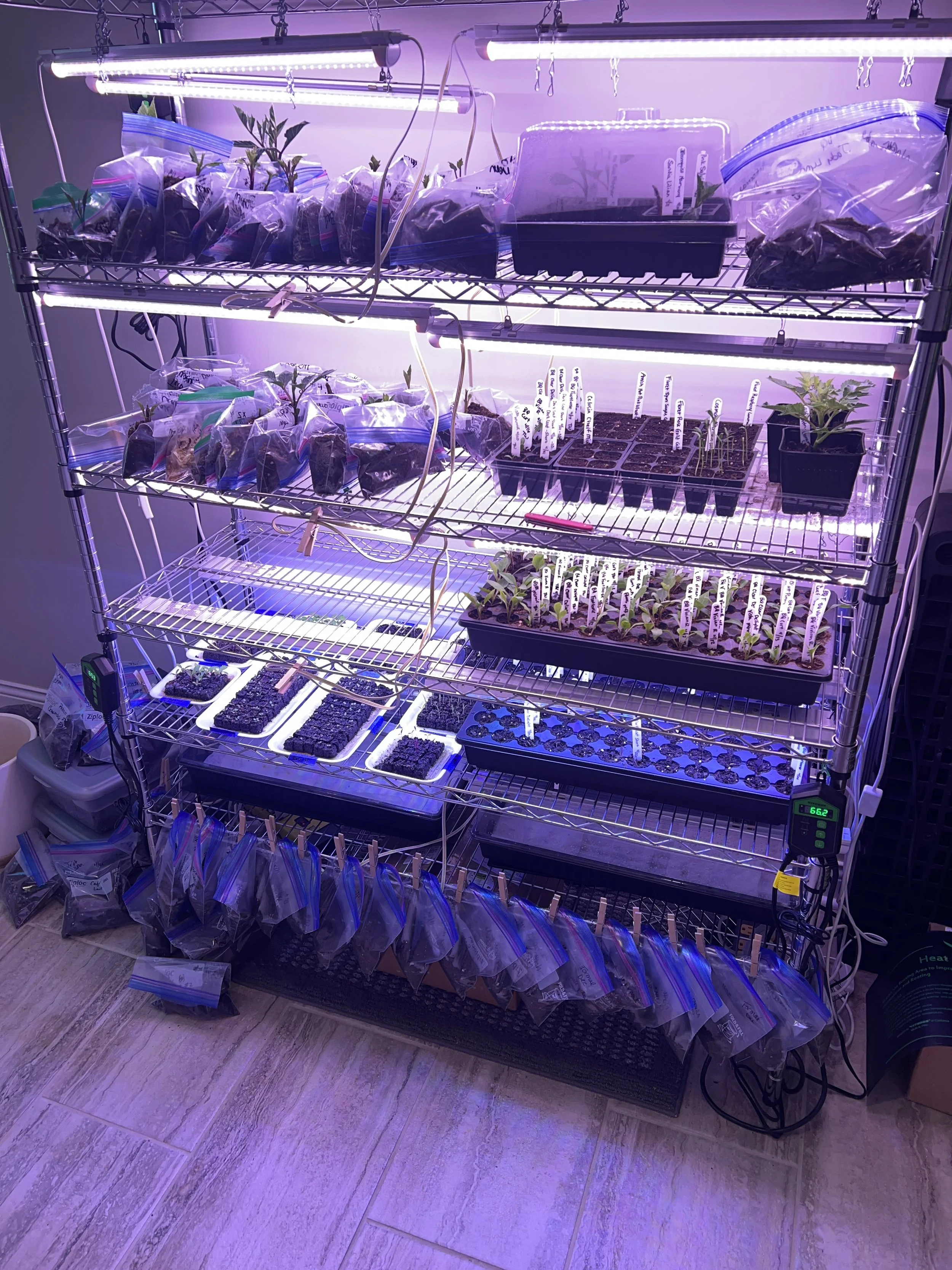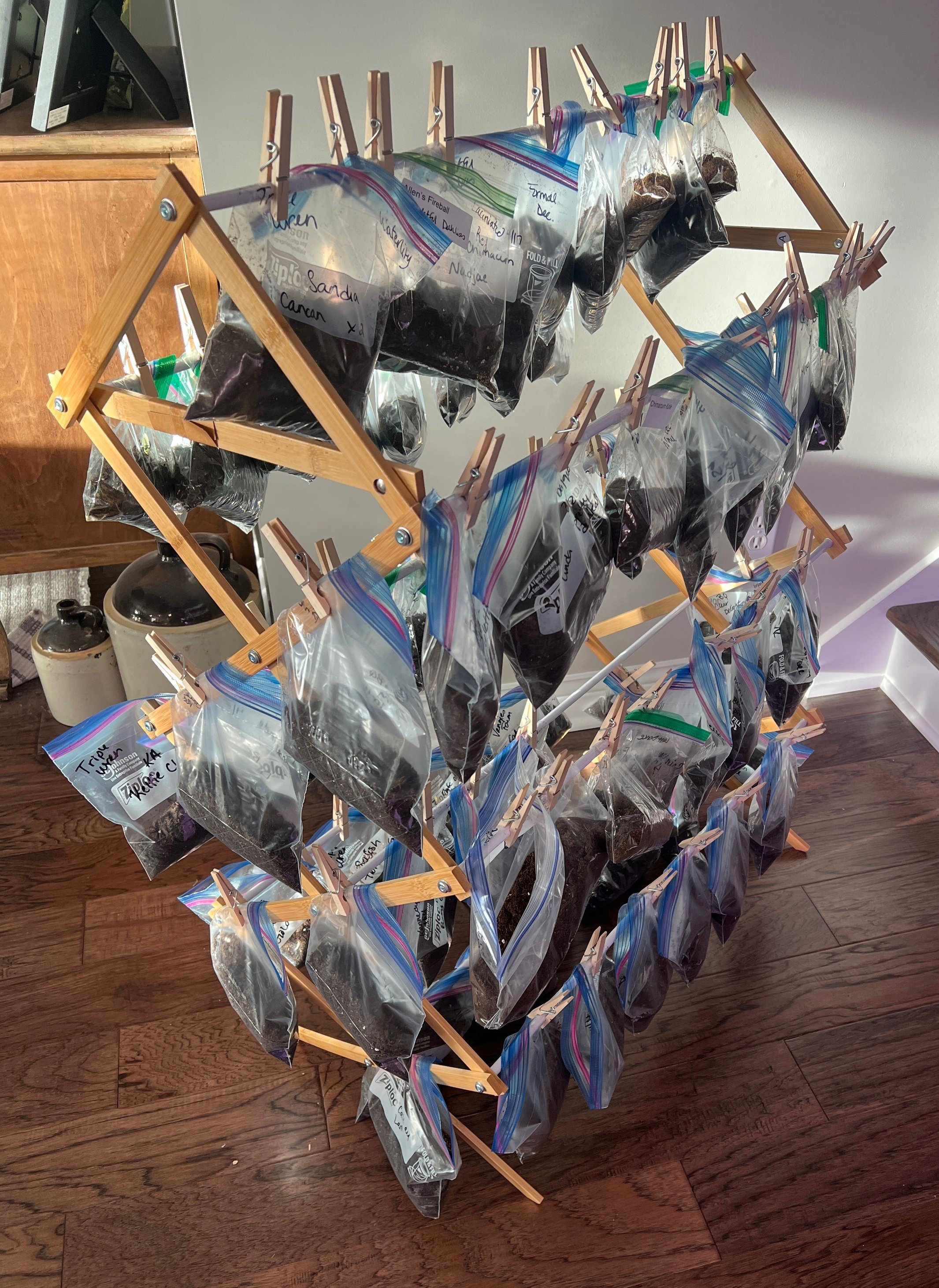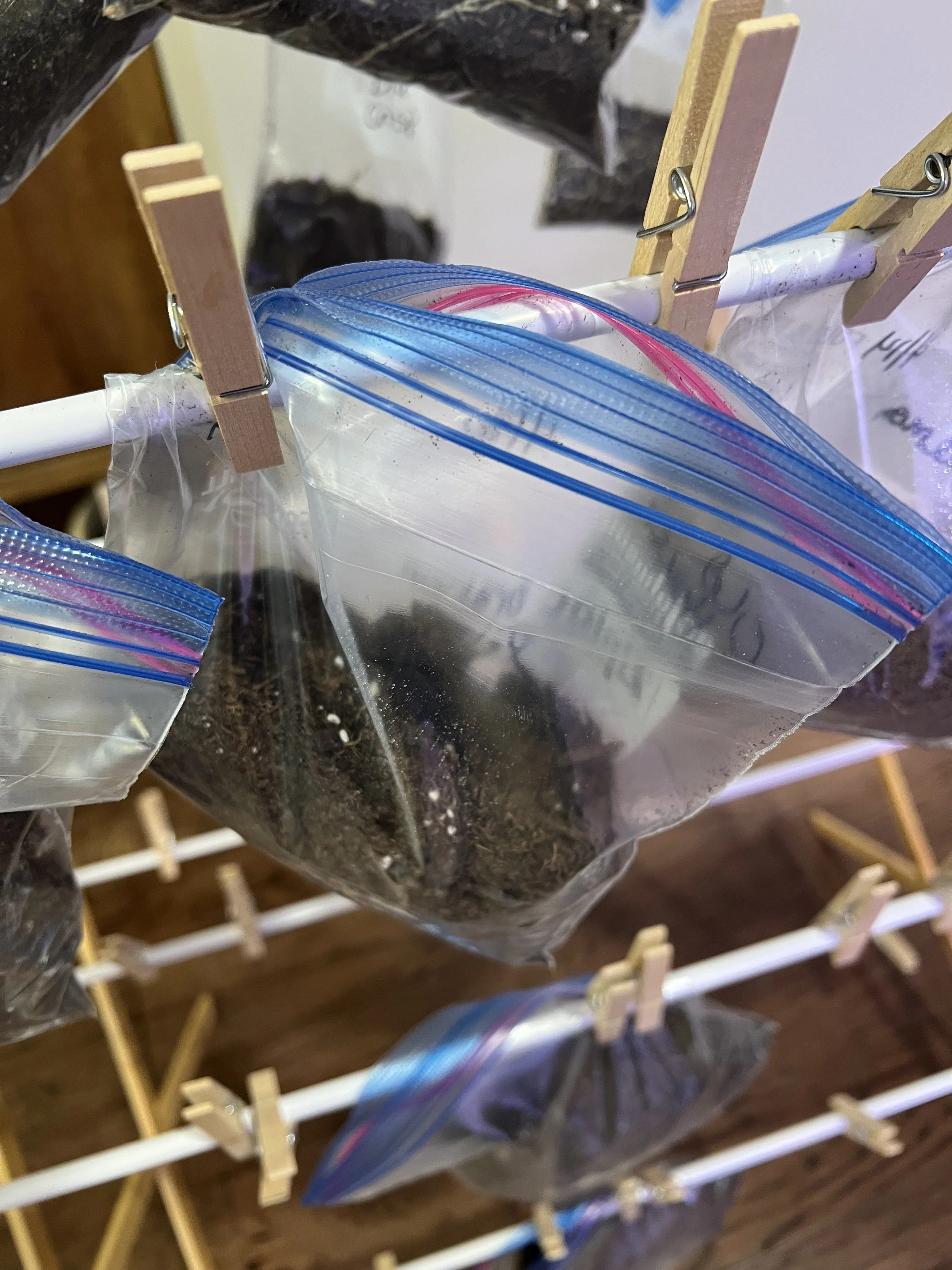 Your tubers don’t need light yet, just a cozy spot to wake up. I use clothes pins and a foldable drying rack to hang my bagged tubers up. This is a great way to save space and start a lot of tubers at once.