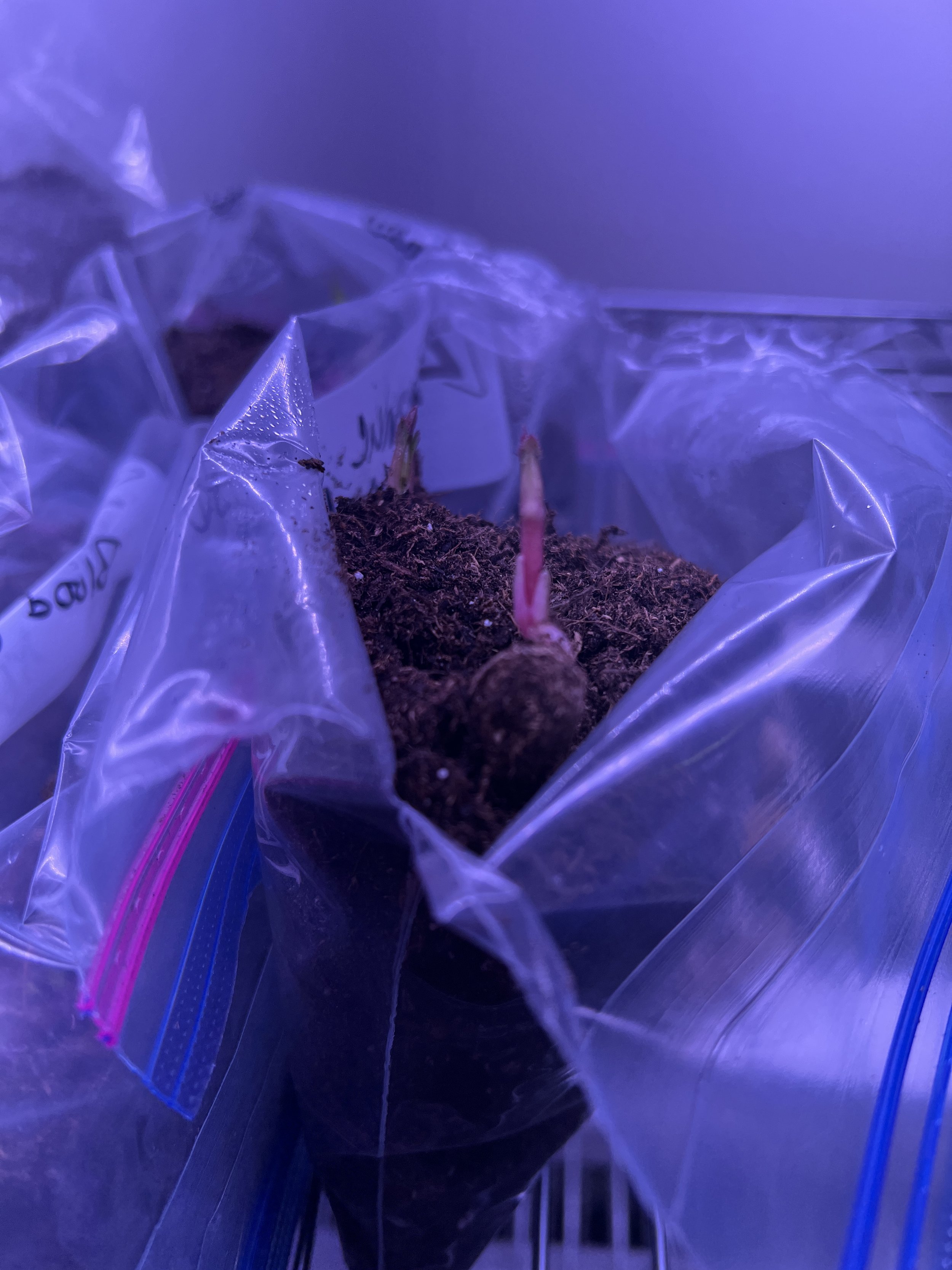 Now the waiting game begins. Some tubers sprout within two weeks, others take longer. During these weeks of waiting your bag may dry out. If this happens you want to respray the inside of the bag/soil with one or two sprays of water to keep the moist environment.