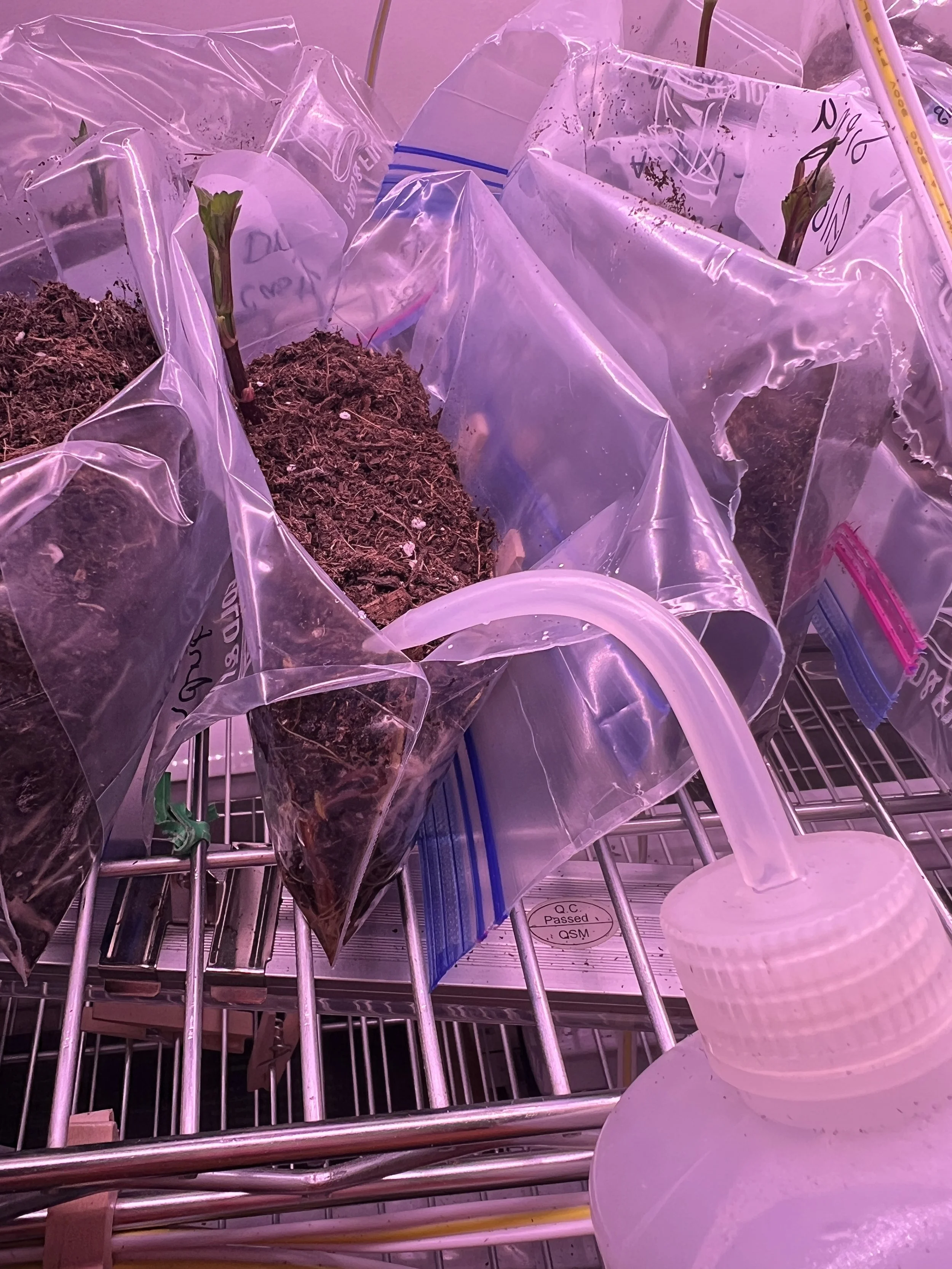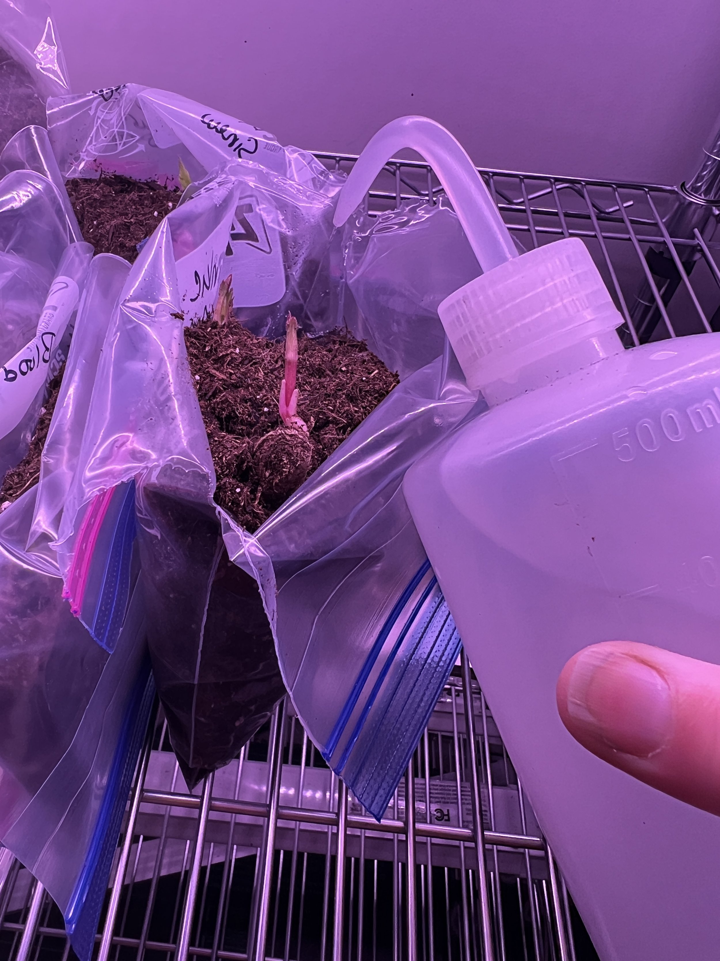 Using a wash bottle I will also start to water the roots. The angled neck of the bottle lets me target just the roots, again helping to prevent an over soaked tuber.